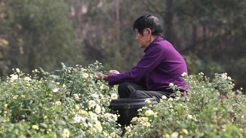 仙人渡镇村民龚世莲说,我每年都来这里摘菊花,一天收入七八十元,离家也近。
