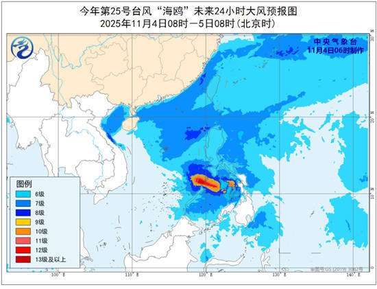 r今年第25号台风“海鸥”已于11月3日晚上由台风级加强为强台风级,并于今天(11月4日)凌晨0时前后在菲律宾莱特岛沿海登陆,登陆时中心附近最大风力达14级(42米/秒)。登陆后“海鸥”减弱为台风级,今天早晨5点钟其中心位于菲律宾群岛中部地区,距离菲律宾马尼拉东南方向大约510公里,就是北纬10.9度、东经123.8度,中心附近最大风力有13级(40米/秒),中心最低气压为960百帕,七级风圈半径200至320公里,十级风圈半径100至140公里,十二级风圈半径40至50公里。